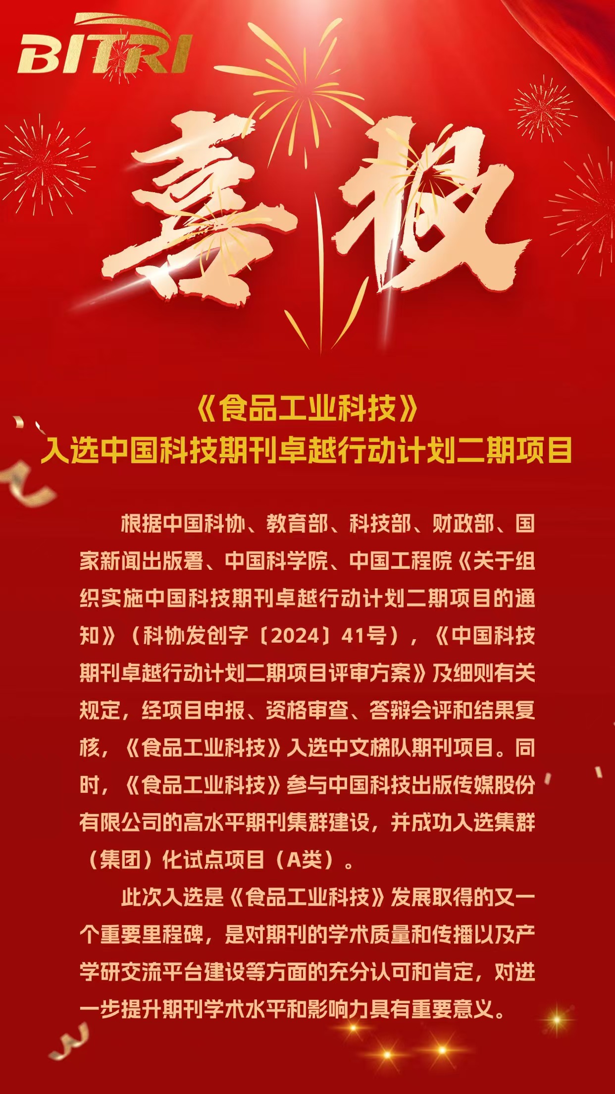 《食品工業科技》入選中國科技期刊卓越行動計劃二期項目